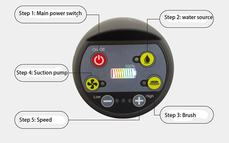 Introduction to the key functions of the display screen (total power supply, water outlet, scrubbing, water absorption, speed adjustment), operate in order to start the equipment